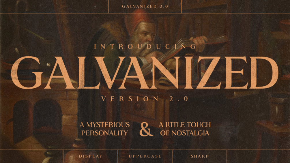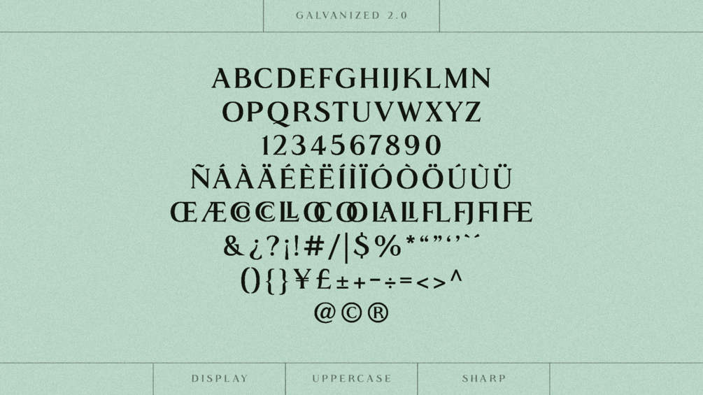 The new and remastered GALVANIZED 2.0 is the evolution of GALVANIZED, preserving its sharp serif display typeface with a mysterious personality and a nostalgic touch. Its high contrast and crisp details give it a unique structure, offering the chance to create striking headlines with exceptional style. Now featuring 142 glyphs and 15 ligatures, it enhances its nostalgic character even further.