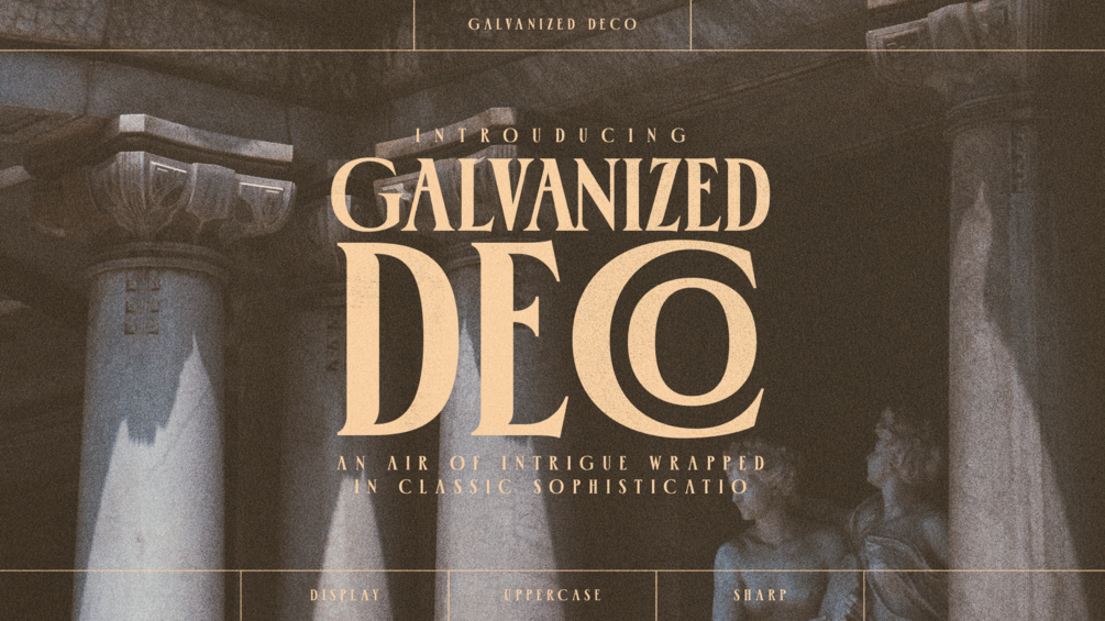 The new and remastered GALVANIZED DECO is a variation of GALVANIZED, adding an air of intrigue wrapped in classic sophistication. Its high contrast and crisp details give it a unique structure, offering the chance to create striking headlines with exceptional style. With 147 glyphs and 15 ligatures, it creates a bold, enigmatic presence defined by timeless lines.